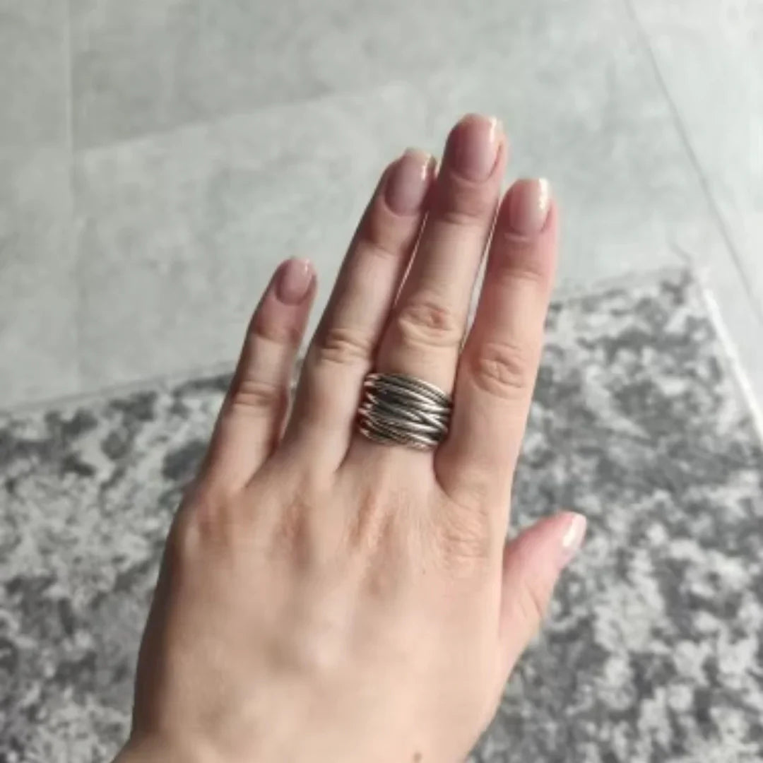 優雅でありながら大胆な印象を持つこのアーティスティックなリングは、自然の美しさを現代的な感性で表現しています。シルバートーンのベースに、磨き上げられたゴールドトーンのワイヤーディテールをあしらい、有機的なウェーブフォルムが指元を上品に包み込みます。マットとポリッシュの仕上げが美しいミックスメタルの表情を生み出し、個性を大切にされる女性のためにデザインされた特別なジュエリーです。